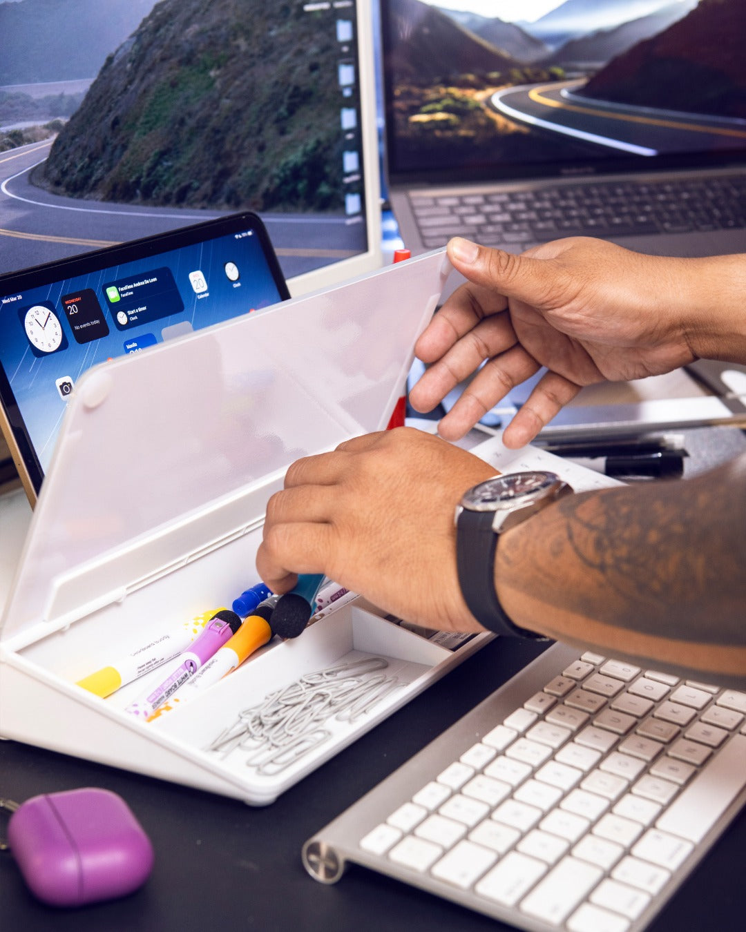 Organize your desk space by storing all of your pens, pencils, highlighters, rulers, paper clips, staples, and other desktop accessories in the NoteBoard hidden accessory storage compartment.