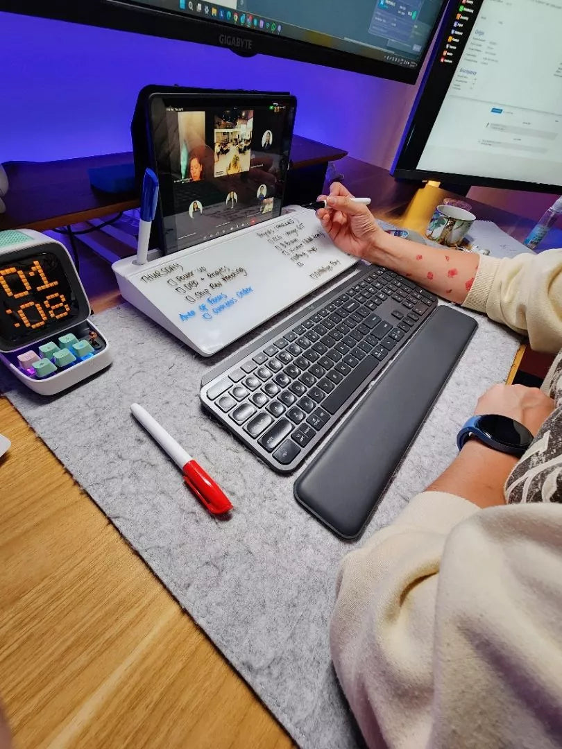 A sleek desktop whiteboard tray designed for seamless note-taking and organization. With its easy-to-clean glass surface and included marker, it's perfect for brainstorming or keeping track of tasks. Boasting built-in trays for your stationary, ensuring pens, markers, and even your smartphone are always within reach.
